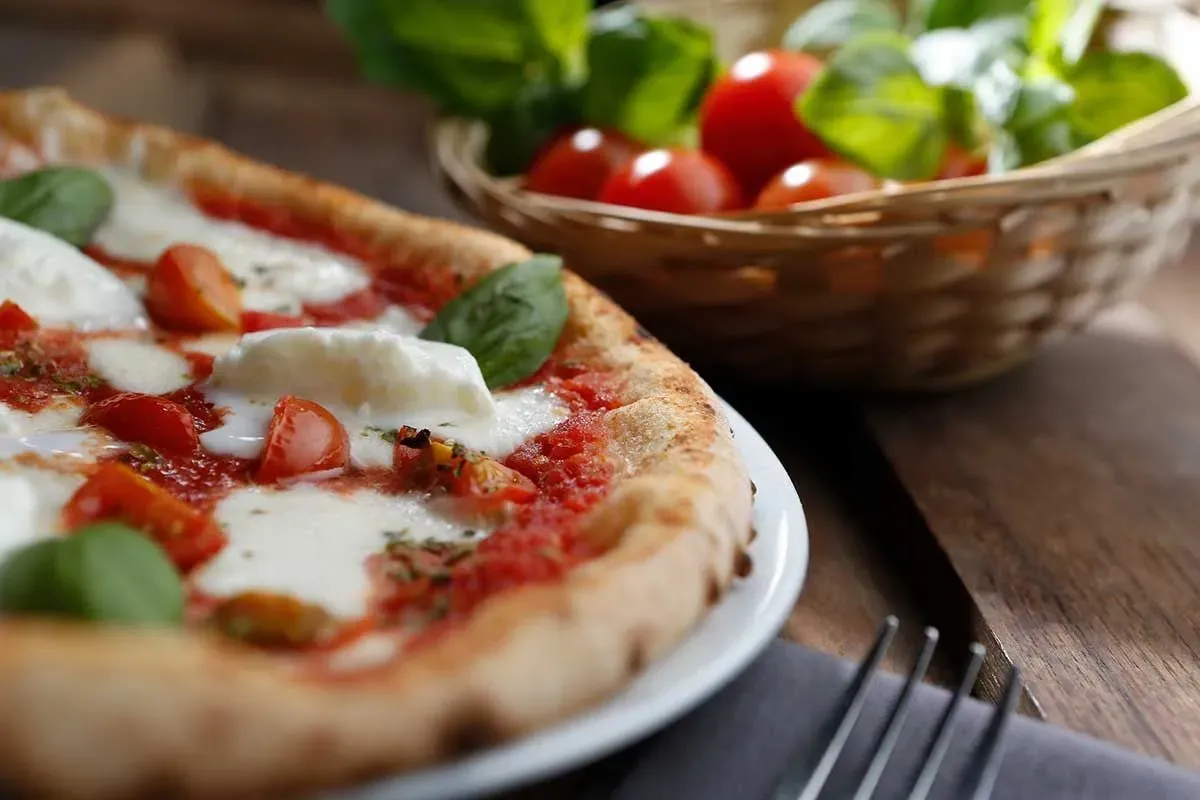 Sauce tomate, mozzarella, Boule de mozzarella Burratina, tomate cerise et Basilic.