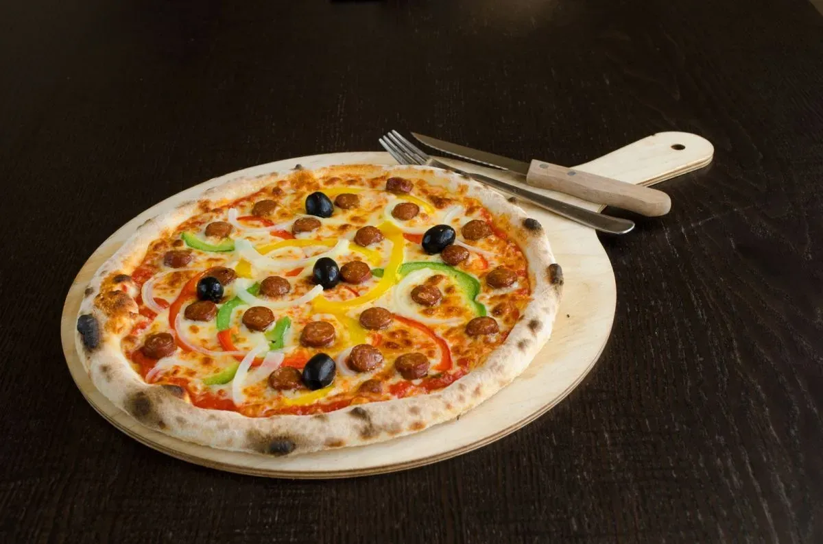 Sauce tomate, mozzarella, merguez, poivrons, oignons, olives et origan.